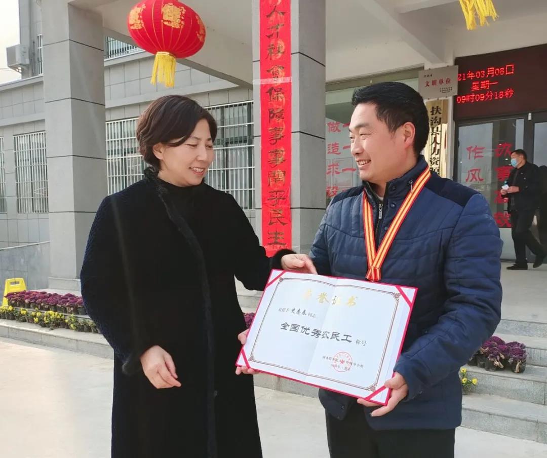3月8日,在扶溝縣人社局辦事大廳門前,縣人社局黨組書記、局長張艷玲將“全國優(yōu)秀農(nóng)民工”獎?wù)?、榮譽證書、光榮冊送到河南省天驕樂器股份有限公司木工段段長史志春手上,對其獲得“全國優(yōu)秀農(nóng)民工”榮譽稱號表示祝賀,勉勵他珍惜榮譽、再接再厲,以更優(yōu)異的成績,為扶溝縣鄉(xiāng)村振興加油助力。②7