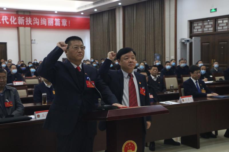 隨后,新當選的扶溝縣人大常委會副主任王世學(xué)(左)、扶溝縣監(jiān)委主任李明朗,手撫《中華人民共和國憲法》,就職宣誓。