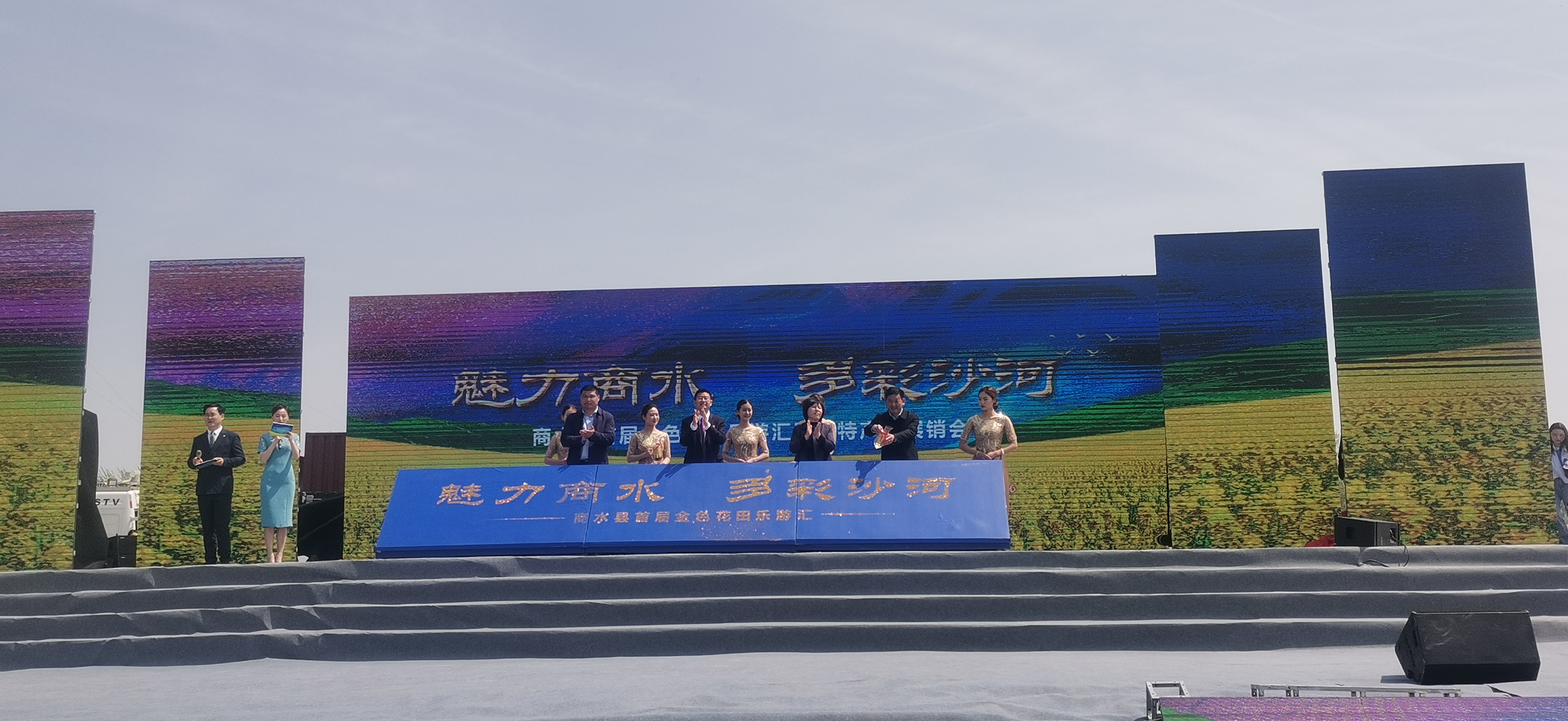 在開幕式上,歡歌熱舞熱情奔放,驚險(xiǎn)雜 技技驚四座,唐俑表演俏皮可愛,一個(gè)個(gè)精彩演出引得游客們掌聲、歡呼聲不斷。一旁的農(nóng)副產(chǎn)品展銷臺(tái)前,鄧城豬蹄、白寺草莓等農(nóng)特產(chǎn)品更是引得游客爭(zhēng)相購(gòu)買。同時(shí),現(xiàn)場(chǎng)還進(jìn)行了首屆魅力商水多彩沙河金色花田樂(lè)游匯首日封發(fā)行儀式,以作開幕紀(jì)念。
