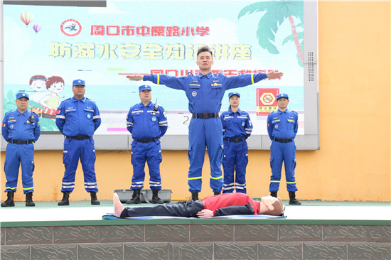 周口市川匯區(qū)藍(lán)天救援隊對全體師生進(jìn)行防溺水自救互救知識講座,并現(xiàn)場進(jìn)行急救演練操作。
