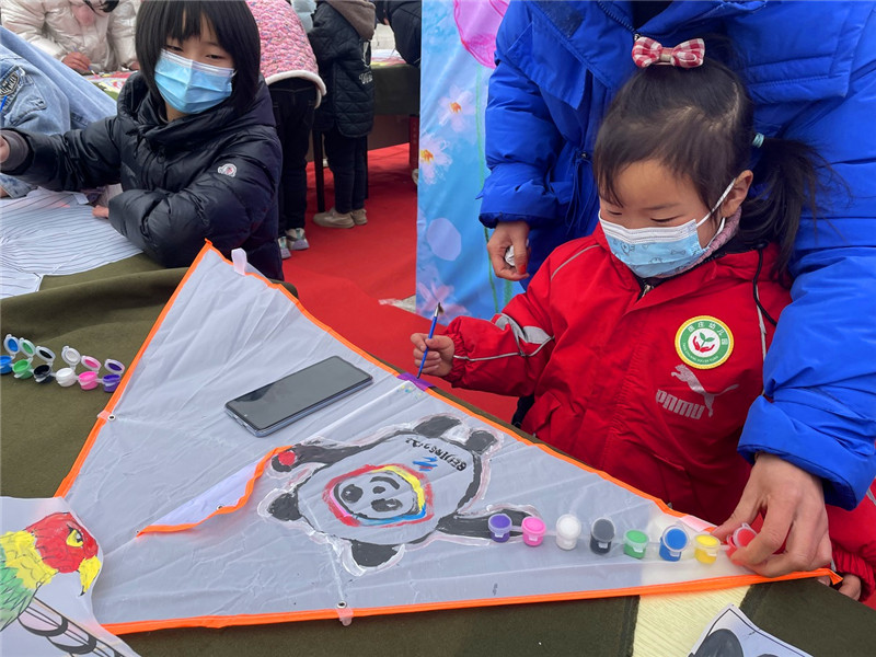 “媽媽你看,我畫的冰墩墩可愛嗎?”2月15日上午,“放飛春天——兒童DIY手繪風(fēng)箏”活動(dòng)在周口市文化藝術(shù)中心西廣場(chǎng)如期舉辦。一名身穿紅色棉服的小女孩在媽媽的幫助下,創(chuàng)作完成了一只畫有“冰墩墩”形象的手繪風(fēng)箏。