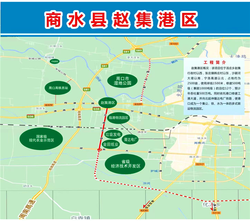2017年,商水縣政府按照前瞻30年、謀劃15年、做實(shí)近5年工作要求,開始規(guī)劃修建位于湯莊鄉(xiāng)趙集行政村以西,張莊鎮(zhèn)韓莊村以東,沙潁河大堤以南,寧洛高速以北的趙集作業(yè)區(qū)。規(guī)劃建設(shè)占地約720畝、總投資6.37億元的趙集港項(xiàng)目,同時(shí)修建12個(gè)1000噸級泊位,其中散貨泊位8個(gè),通用泊位2個(gè),多用途泊位2個(gè),占用岸線1250米,預(yù)計(jì)年吞吐量達(dá)475萬噸。碼頭采用順岸式布置,結(jié)構(gòu)采用重力式扶壁結(jié)構(gòu),前沿配置30噸門座式固定吊裝卸作業(yè)。港口涵蓋貨物拆解區(qū)、散件堆放區(qū)等4個(gè)功能區(qū),集裝箱露天堆場、大型貨車停車場等5個(gè)場地。圍繞趙集港,高標(biāo)準(zhǔn)規(guī)劃建設(shè)占地約6.2平方公里的多式聯(lián)運(yùn)臨港經(jīng)濟(jì)園區(qū),下設(shè)金田紙業(yè)、建材倉儲(chǔ)兩個(gè)物流園區(qū),涵蓋建材及建材制品園區(qū)、造紙業(yè)原料及成品園區(qū)、紡織服裝原料及成品園區(qū)3個(gè)功能園區(qū)。該項(xiàng)目建成投入使用后,不但能加快商水縣紡織園區(qū)、循環(huán)園區(qū)、經(jīng)濟(jì)開發(fā)區(qū)、隆達(dá)電廠等企業(yè)物質(zhì)的流轉(zhuǎn),而且能使商水港成為周口沙潁河重要的鐵運(yùn)、陸運(yùn)、水運(yùn)交通樞紐、貨物貿(mào)易和物流中轉(zhuǎn)聚集區(qū),從而進(jìn)一步促進(jìn)商水經(jīng)濟(jì)的健康、快速發(fā)展。
