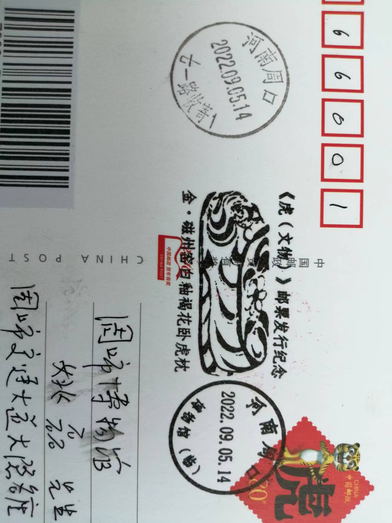 9月5日,由中國郵政特別制作的《虎文物》特種郵票正式發(fā)行。此套郵票共有6枚,每枚上都印有一件珍貴的虎文物。郵票圖案名稱分別為“商·伏鳥雙尾青銅虎”“春秋·青玉虎形佩”“漢·白虎瓦當”“漢·錯金銘文銅虎節(jié)”“金·磁州窯白釉褐花臥虎枕”“清·皮影飛虎”。其中第五枚郵票圖案中的“金·磁州窯白釉褐花臥虎枕”就是來自周口市博物館的珍貴文物,該郵票運用光油和浮雕擊凸工藝,塑造了虎安詳、可愛的形象。