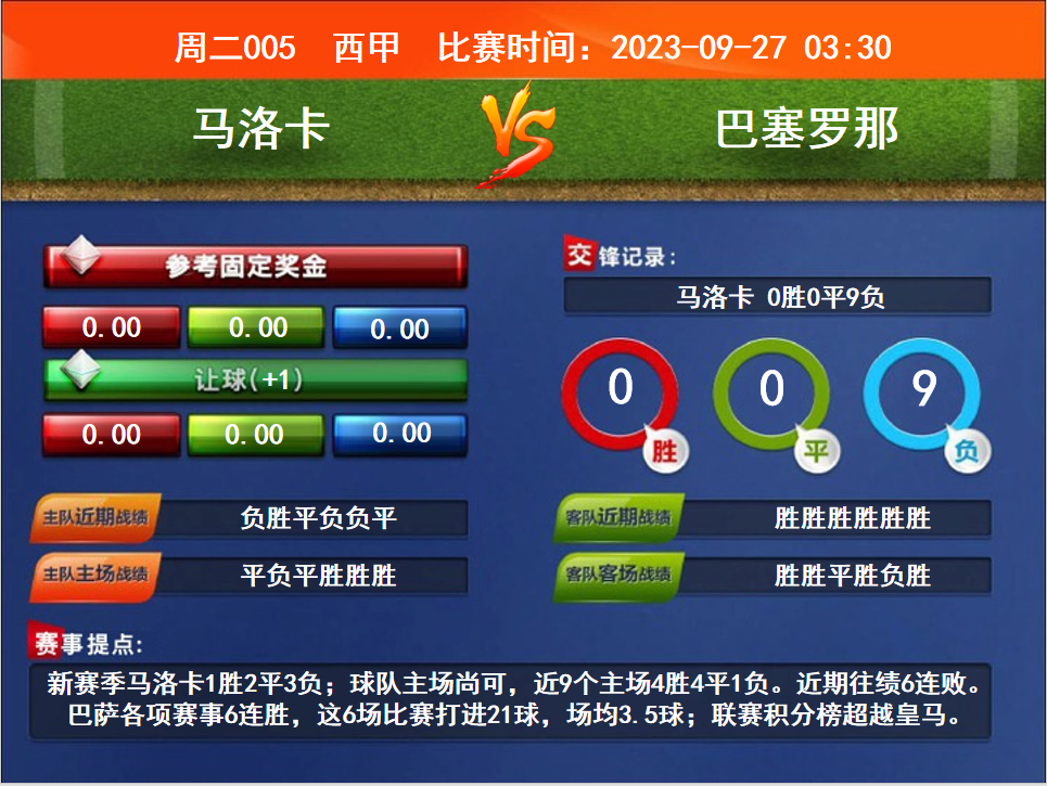 比賽時間:2023-09-27 03:30賽事提點(diǎn):新賽季馬洛卡1勝2平3負(fù);球隊(duì)主場尚可,近9個主場4勝4平1負(fù)。近期往績6連敗。巴薩各項(xiàng)賽事6連勝,這6場比賽打進(jìn)21球,場均3.5球;聯(lián)賽積分榜超越皇馬。
