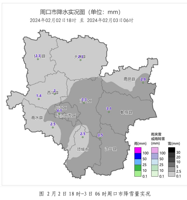 2日18時(shí)﹣3日06時(shí):我市出現(xiàn)中到大雪,最大降雪量出現(xiàn)在川匯區(qū) 4.1 毫米。各國家站降雪量(毫米):川匯區(qū)4.1、沈丘3.5、淮陽3.3、鄲城3.1、鹿邑2.9、商水2.5、項(xiàng)城2.5、太康2.3、扶溝2.3、西華2.0、黃泛區(qū)1.4。
