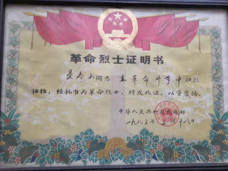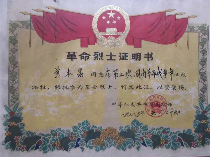 黃德耀的小爺爺黃成香于1935年3月在哥哥黃本富犧牲后的第2個(gè)月參加紅軍。1940年,黃成香在安徽省定遠(yuǎn)縣對(duì)日軍戰(zhàn)斗中英勇?tīng)奚?,尸骨無(wú)存,年僅17歲。