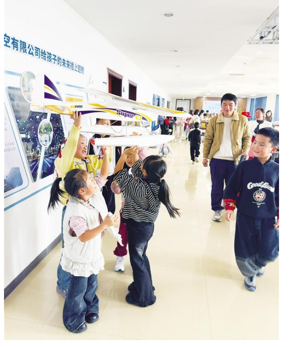 小記者近距離觀察航模。近日,周口日報小記者部攜手周報航空俱樂部,組織70余名小記者開展了一場別開生面的無人機(jī)科普研學(xué)活動,小記者在沉浸式體驗中感受到了科技的魅力。