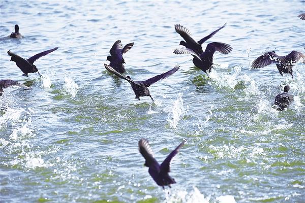 11月16日,在淮陽龍湖國家濕地公園,一群國家二級保護(hù)動(dòng)物白骨頂雞在此集結(jié)。